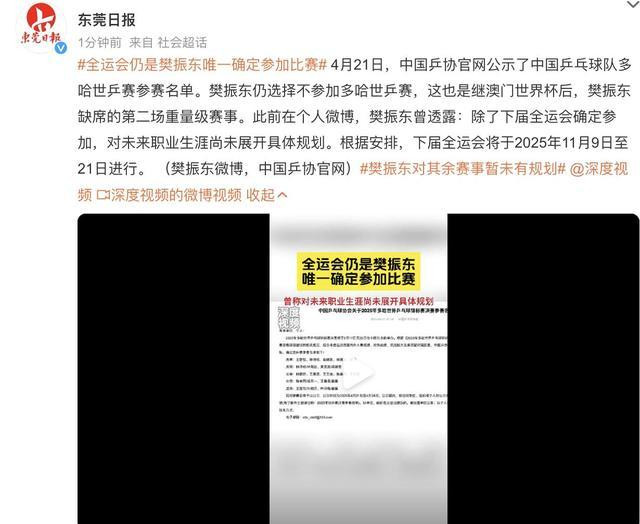 根据权威媒体的透露,樊振东在之前的社交平台上已经提前向球迷分享了自己的未来职业规划。他明确表示,除了下一届的全运会确定参加之外,他未来的职业生涯还没有展开具体的规划。下一届全运会将于2025年11月举行,因此,球迷们应该认识到,樊振东此次宣布退出世乒赛,也是出于他对未来职业生涯的考虑。